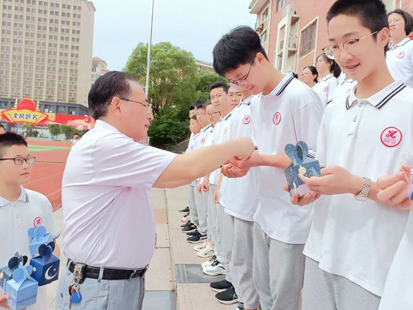 王禮琴校長、副校長曹蕓、余華林一一為獲獎同學們佩戴金榜題名卡,贈送平安果。希望同學們不忘耕耘志,一點一點向著自己的目標靠近。
