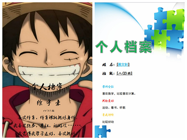 此次參賽作品的文字內(nèi)容包含四方面:一、基本信息;二、學(xué)科介紹;三、興趣愛好;四、自我評價。同學(xué)們以自己為主,發(fā)揮想象,根據(jù)自己的興趣愛好,自由創(chuàng)作。