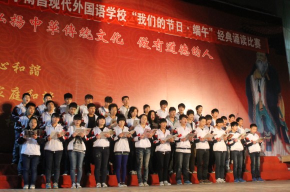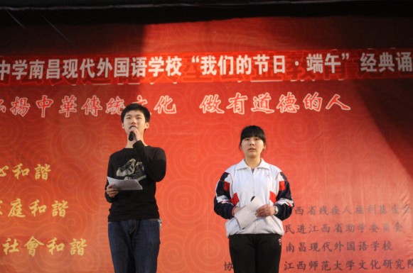 4月19日下午,南昌現(xiàn)代外國語學(xué)校(迎賓校區(qū))大禮堂內(nèi)書聲瑯瑯,歌聲飛揚(yáng),掌聲不斷,為弘揚(yáng)中華傳統(tǒng)文化,增強(qiáng)學(xué)生民族自豪感,培養(yǎng)有科學(xué)素養(yǎng)、有人文素養(yǎng)、有個性特長的陽光學(xué)子,我校隆重舉辦了“我們的節(jié)日·端午”中華經(jīng)典誦讀比賽。