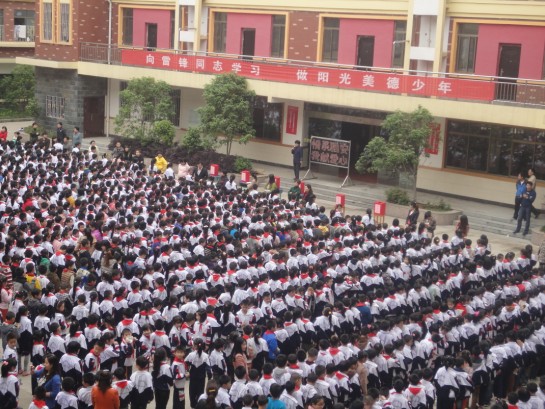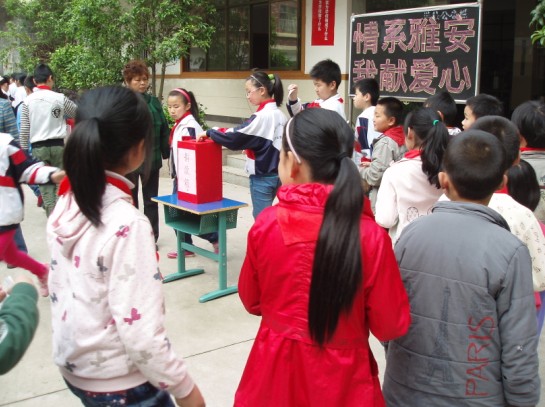 當(dāng)日下午3時(shí),現(xiàn)外象湖校區(qū)全校師生兩千一百多人集合在操場(chǎng)上,學(xué)生按晨會(huì)隊(duì)形排列,全場(chǎng)肅穆。校長(zhǎng)李金玉在活動(dòng)開始前發(fā)表了“天災(zāi)無情,人間有愛,一方有難,八方支援”的重要講話。3時(shí)20分左右,操場(chǎng)上響起了熟悉的歌聲“愛的奉獻(xiàn)”,捐款活動(dòng)正式開始。學(xué)校領(lǐng)導(dǎo)率先捐款,各位老師緊隨其后。各班學(xué)生在班主任與配班老師的帶領(lǐng)下,有序捐款。師生捐款的場(chǎng)面壯觀、氣氛莊重。孩子們鄭重地把自己的愛心放進(jìn)了捐款箱,有的捐出了自己的壓歲錢、零花錢,有的捐出了自己的早餐錢,有的捐出了買文具的錢……
