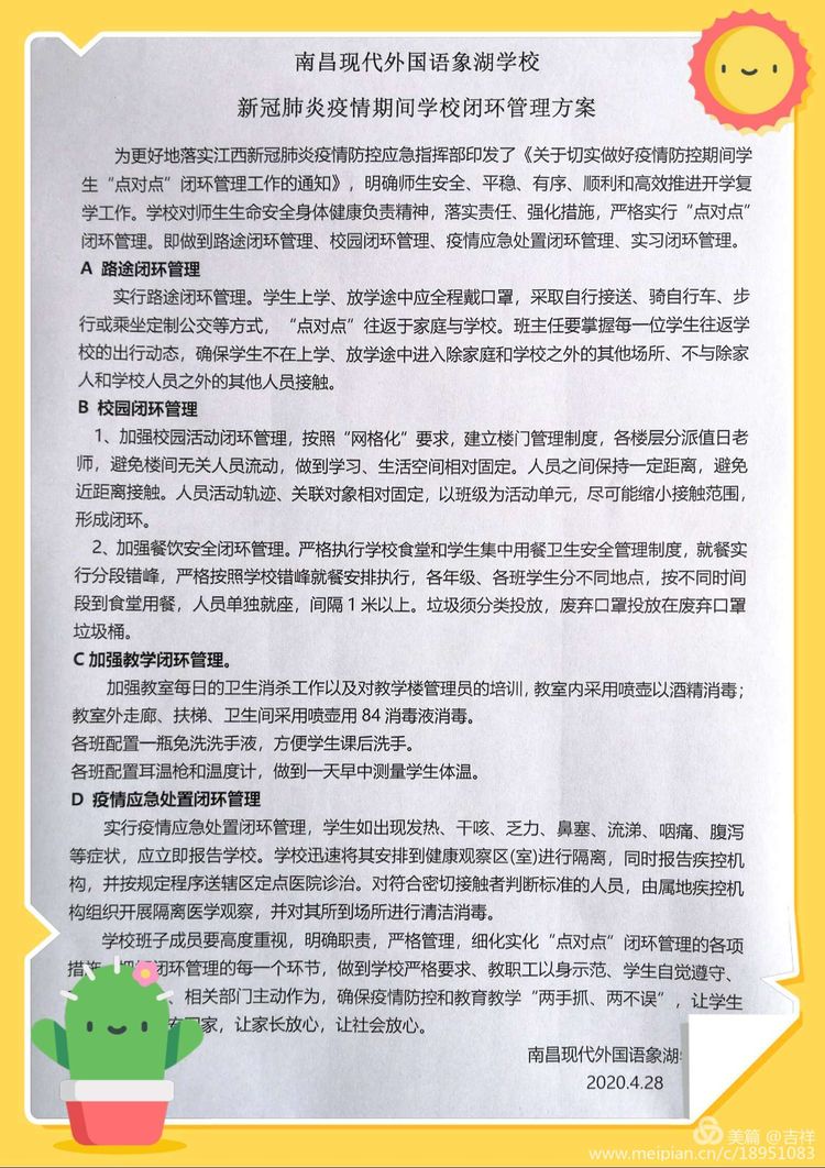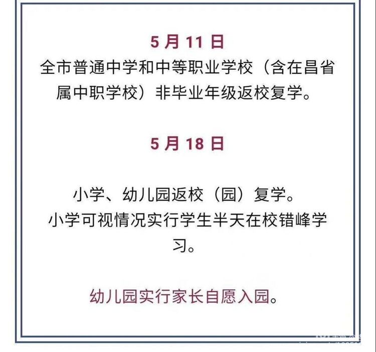我們終于盼來(lái)了,南昌市教育局發(fā)出全市學(xué)生返校通知,我們已經(jīng)按下今年春季開(kāi)學(xué)的啟動(dòng)鍵,即將共同攜手重返校園。目前,學(xué)校開(kāi)學(xué)各項(xiàng)準(zhǔn)備工作已按要求落實(shí)到位,學(xué)校已經(jīng)對(duì)教室、樓道、操場(chǎng)等公共場(chǎng)所進(jìn)行全面消殺,防疫物資已按要求儲(chǔ)備,應(yīng)急演練已按規(guī)則開(kāi)展。為保證開(kāi)學(xué)工作安全、平穩(wěn)、有序進(jìn)行,讓社會(huì)放心、讓家長(zhǎng)安心、讓學(xué)生用心,以下幾點(diǎn)開(kāi)學(xué)須知,請(qǐng)家長(zhǎng)陪同自己的孩子認(rèn)真閱讀。