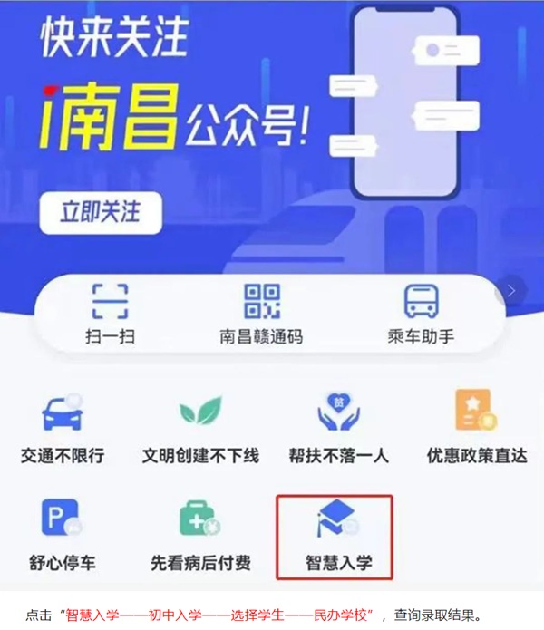 登陸APP“i南昌”或微信小程序“i南昌”點(diǎn)擊“智慧入學(xué)”,查詢錄取結(jié)果。
