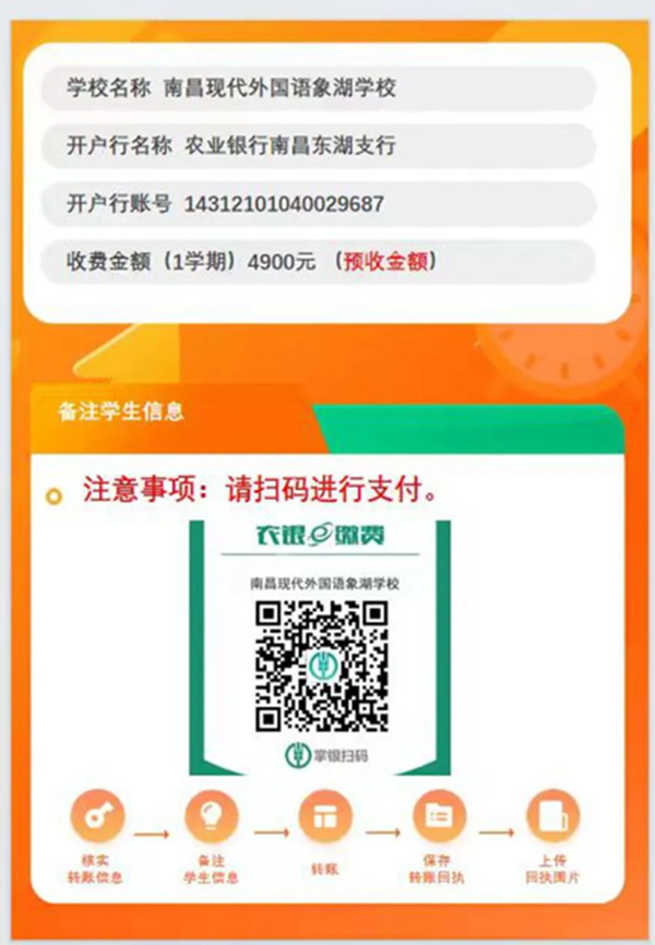 家長(zhǎng)通過(guò)掃碼支付或手機(jī)銀行直接將學(xué)費(fèi)轉(zhuǎn)入學(xué)校對(duì)公賬戶——“轉(zhuǎn)賬附言”欄必須備注學(xué)生姓名及身份證號(hào)碼——登陸“i南昌”平臺(tái),根據(jù)提示上傳回執(zhí)單(8月10日17點(diǎn)前上傳)。