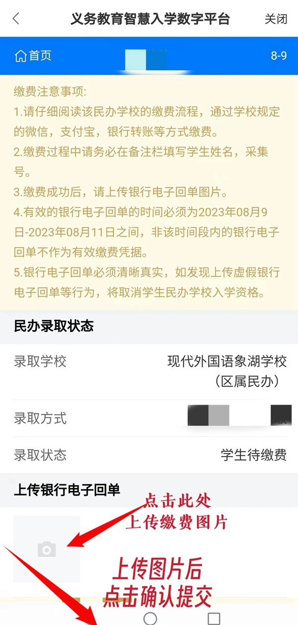 ● 只有家長(zhǎng)在“i南昌”中“智慧入學(xué)”平臺(tái)上傳銀行回執(zhí)后,我校才能再次點(diǎn)擊“繳費(fèi)確認(rèn)錄取”按鈕,即完成學(xué)生全部錄取流程。