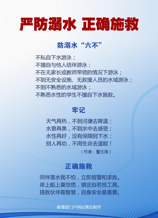 六、教育孩子一旦發(fā)現(xiàn)有人溺水,應(yīng)及時(shí)呼救,讓成年人來搶救,不可盲目下水施救。不準(zhǔn)不懂水性的學(xué)生擅自下水施救。