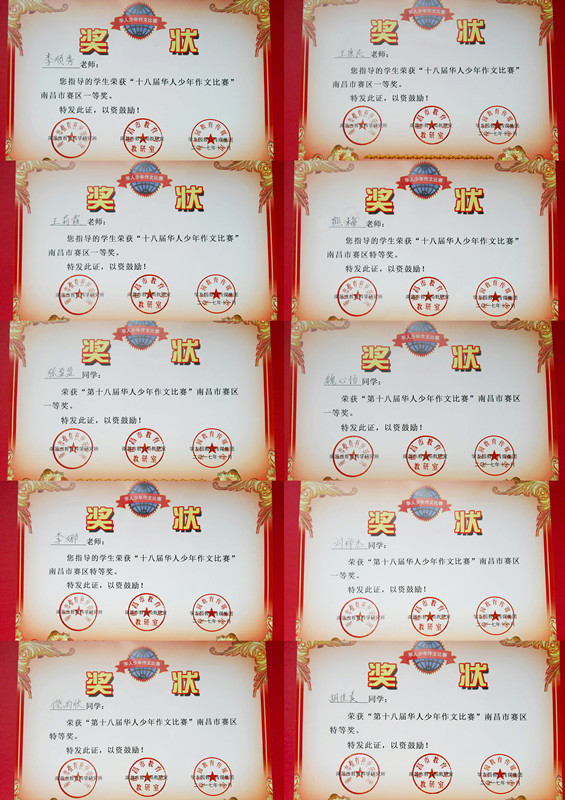 為建設(shè)書香校園,讓學(xué)生從閱讀和寫作中培養(yǎng)創(chuàng)造力和想象力,形成熱愛中華優(yōu)秀傳統(tǒng)文化的深厚感情,做祖國的好少年,致力于實(shí)現(xiàn)宏偉的中國夢。南昌現(xiàn)代外國語學(xué)校(象湖校區(qū))積極組織學(xué)生參與南昌市教育局教研室組織的第十八屆“騰訊智慧校園杯”華人少年作文比賽南昌賽區(qū)活動。2月2日傳來喜訊,該校五名學(xué)生喜獲佳獎,其中九(10)班胡佳美、六(1)班饒雨欣兩位同學(xué)榮獲南昌市賽區(qū)特等獎;六(4)班劉梓杰、九(1)張盈盈、八(1)班魏心怡三位同學(xué)榮獲南昌市賽區(qū)一等獎;李娜、熊梅老師指導(dǎo)學(xué)生榮獲南昌市賽區(qū)特等獎;李順秀、王康民、王莉霞老師指導(dǎo)的學(xué)生榮獲南昌市賽區(qū)一等獎。