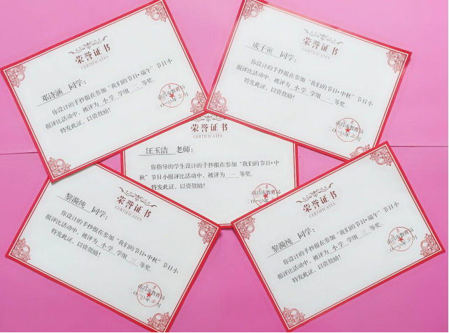 經(jīng)專家評審,此次上交的4幅作品全部獲獎(jiǎng):六(3)成子寅獲南昌市“我們的節(jié)日·中秋”節(jié)日小報(bào)一等獎(jiǎng);六(1)黎漪純獲三等獎(jiǎng)。六(1)鄧詩涵獲南昌市“我們的節(jié)日·清明”節(jié)日小報(bào)二等獎(jiǎng);六(1)黎漪純獲三等獎(jiǎng)。教研組長汪玉潔獲南昌市“我們的節(jié)日·中秋”節(jié)日小報(bào)優(yōu)秀指導(dǎo)獎(jiǎng),這些優(yōu)異的成績充分展示了我校教育教學(xué)的成果。