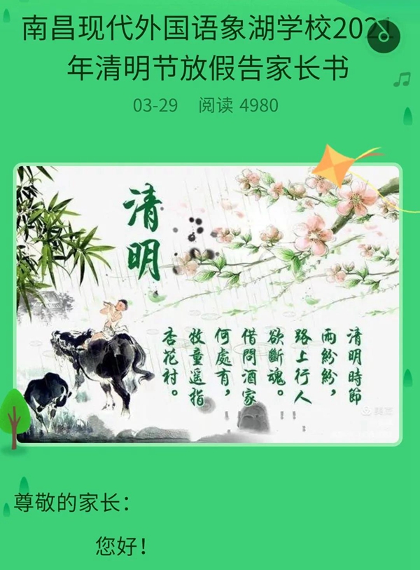 3月29日,學(xué)校下發(fā)了《2021年清明節(jié)假期告家長(zhǎng)書》,告知了家長(zhǎng)放假時(shí)間,從五個(gè)方面提醒家長(zhǎng)假期注意事項(xiàng):1、森林防火人人有責(zé)。2、積極倡導(dǎo)“環(huán)保、健康、文明、低碳”的祭掃方式。3、教育孩子注意節(jié)日安全。4、做好疫情防控工作。5.文明教育日?;8婕议L(zhǎng)書一經(jīng)發(fā)出得到了家長(zhǎng)的大力配合和關(guān)注,瀏覽量達(dá)到了4980人次。