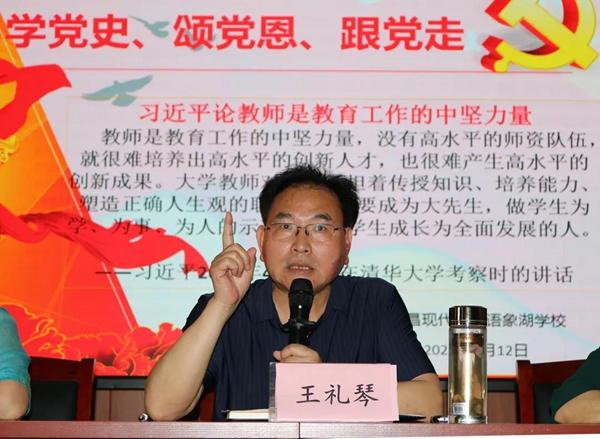 隨后,王禮琴校長(zhǎng)以“學(xué)黨史,頌黨恩,跟黨走”為主題強(qiáng)調(diào)教職工要學(xué)黨史,悟思想,強(qiáng)本領(lǐng)。引用習(xí)近平總書記關(guān)于教育的重要論述和教師隊(duì)伍建設(shè)的重要指示精神,提出“強(qiáng)師德,提師能,鑄師魂”教師管理理念,并要求全體教師明確新時(shí)代師德師風(fēng)的新標(biāo)準(zhǔn)、新要求,把師德規(guī)范內(nèi)化于心,外化于行,在日常教育教學(xué)和管理服務(wù)工作中切實(shí)踐行,讓良好的師德師風(fēng)祛邪向善、浸潤(rùn)人心。