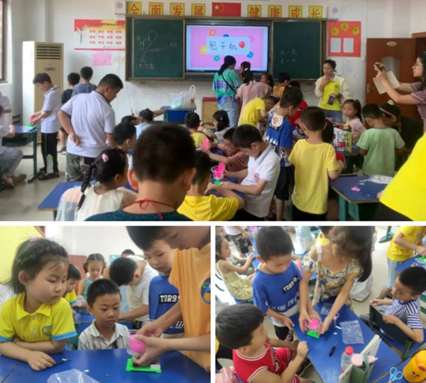 航模課上,孩子們體驗了自制“甩干機”一課。好奇的孩子們瞪大了眼睛,緊盯著哥哥姐姐們給他們講解:先把所有零件按順序拼接好,再把電線小心地纏在電流的接觸點上,然后按正負(fù)極安裝好電池……最后,小小甩干機就做好了。他們把浸過水的小布頭放進甩干機里,小心翼翼地啟動按鍵,甩干機“呼呼”地轉(zhuǎn)動起來,不一會兒小布頭就甩干了!孩子們開心地拍起手來,高喊著:“航模課真是太有趣了!”