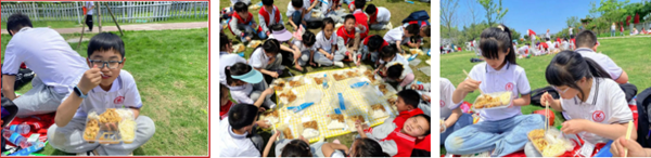 中午十二點(diǎn),溫暖的陽光灑在孩子們稚嫩的臉上,同學(xué)們以班級(jí)圍坐成一圈一圈,狼吞虎咽地干起飯來,原來在戶外就餐更是別有一番風(fēng)味。
