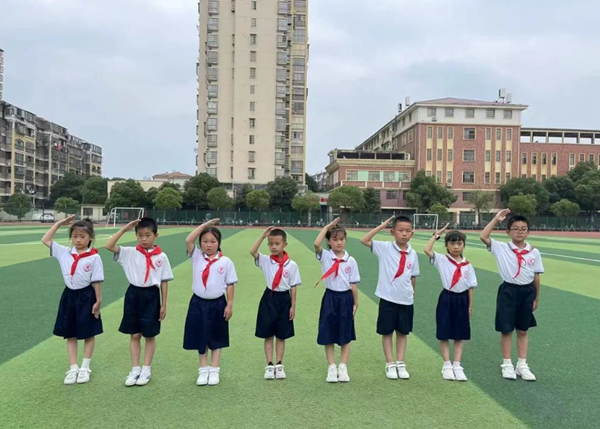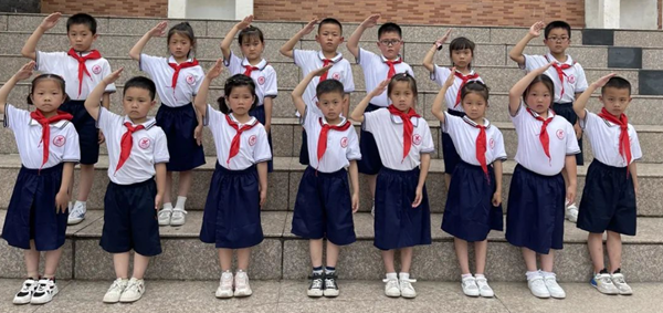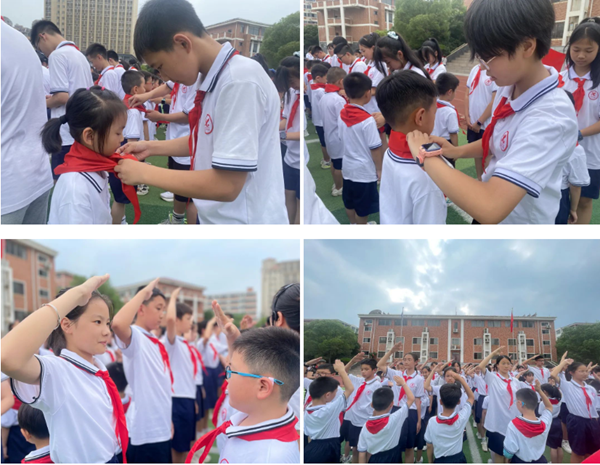 激動人心的時(shí)刻到來了,少先隊(duì)員代表為新隊(duì)員佩戴紅領(lǐng)巾,新隊(duì)員們個個昂首挺胸,臉上難掩激動的心情,眼中閃爍著期盼的光芒,新老隊(duì)員互相敬禮,互相將信念植根心中——今天做祖國的好兒童,明天做祖國的建設(shè)者!