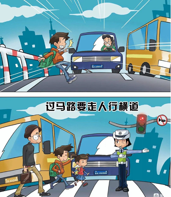 1.遵守交通規(guī)則,橫過馬路要左右看并走斑馬線,不橫跨護(hù)欄。過十字路口要一停、二看、三通過。
