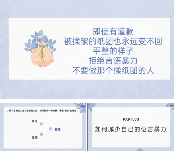 孩子們進(jìn)入初中,同時進(jìn)入了青春期,隨著思維的日漸成熟和自我意識的覺醒,在與同伴相處過程中,容易發(fā)生矛盾。如給同學(xué)起外號、嘲笑他人等,而矛盾的產(chǎn)生往往來源于語言上的沖突。但孩子們卻沒有意識到這種看似玩笑的語言,其實(shí)是一種語言暴力,會對他人造成心理傷害,后果嚴(yán)重。