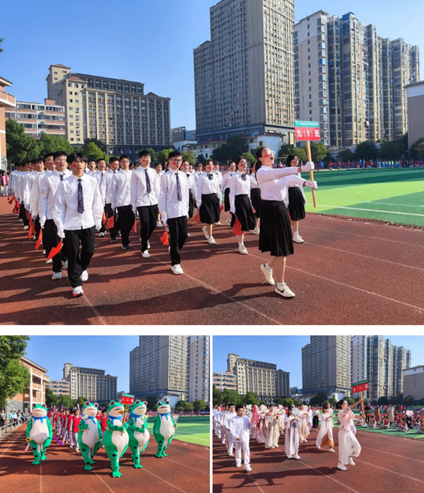 以年級為單位的各班級方隊的同學(xué)們邁著昂揚的步伐,依次進入主席臺。融匯傳統(tǒng)古典元素,改革現(xiàn)代爵士舞、啦啦操 、武術(shù)等各具創(chuàng)意的表演形式,活力四射,動感十足,為校運會增添了無限的魅力,將開幕式氣氛推向高潮。