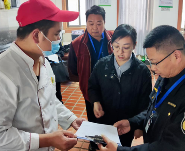 2023年11月21日下午,南昌縣縣委常委統(tǒng)戰(zhàn)部皮部長、八月湖街道辦市場監(jiān)管分局李局長一行深入我校全面檢查了學(xué)校食堂的臺賬情況及食品安全工作。