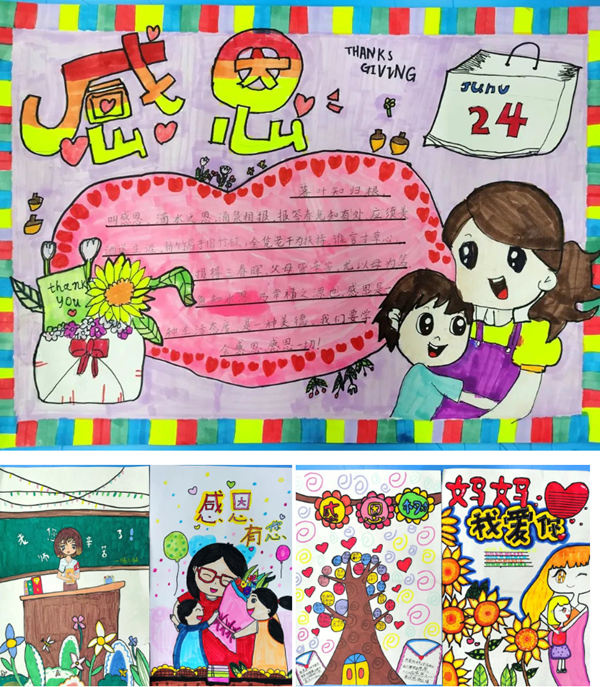 通過老師的指導(dǎo),學(xué)生們利用了繪畫和手工等方式,表達(dá)對家人、對老師、對同學(xué)、對祖國的感恩。此次活動共計收到學(xué)生繪畫作品一百余幅,風(fēng)格鮮明,情境人物風(fēng)景包羅萬象。