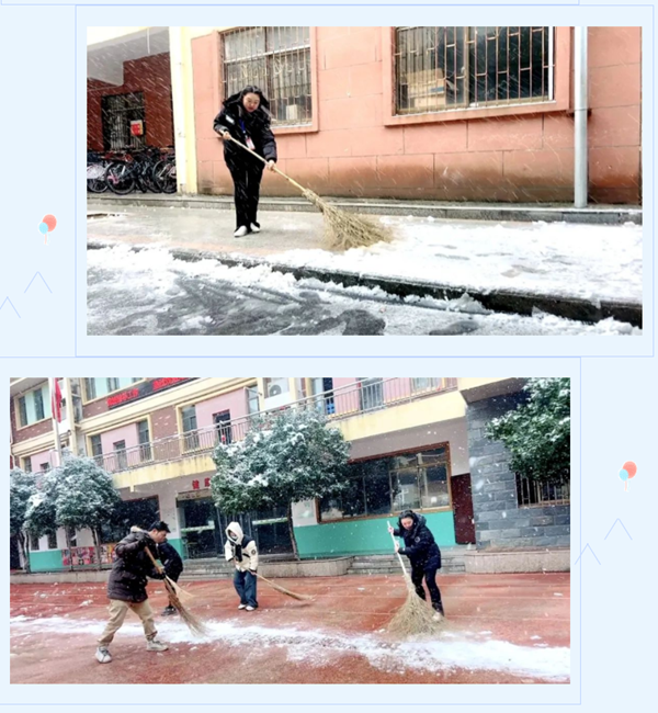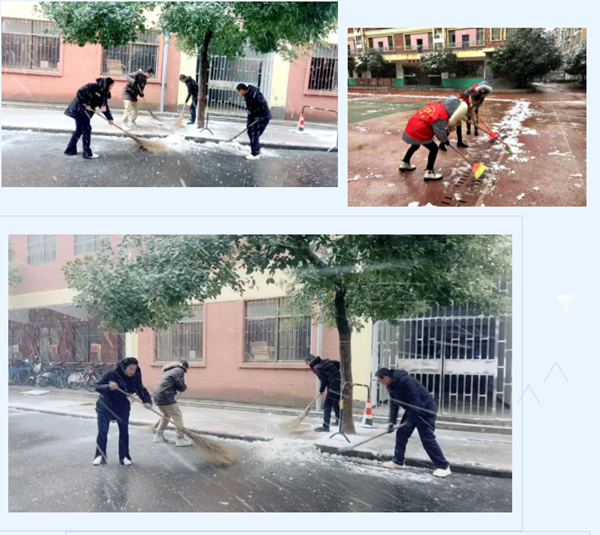 為確保學(xué)生在校安全和學(xué)校工作正常進(jìn)行,我校領(lǐng)導(dǎo)班子第一時(shí)間啟動(dòng)雨雪天氣工作應(yīng)急預(yù)案,校領(lǐng)導(dǎo)帶領(lǐng)行政、老師、安保人員、投入到掃雪除冰活動(dòng),保障校園安全。