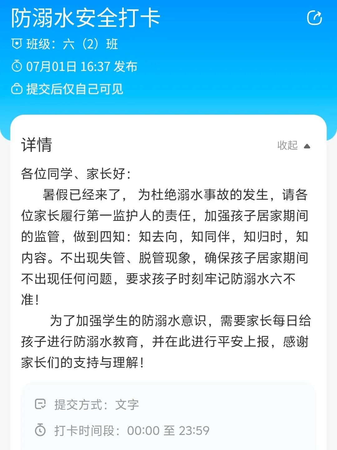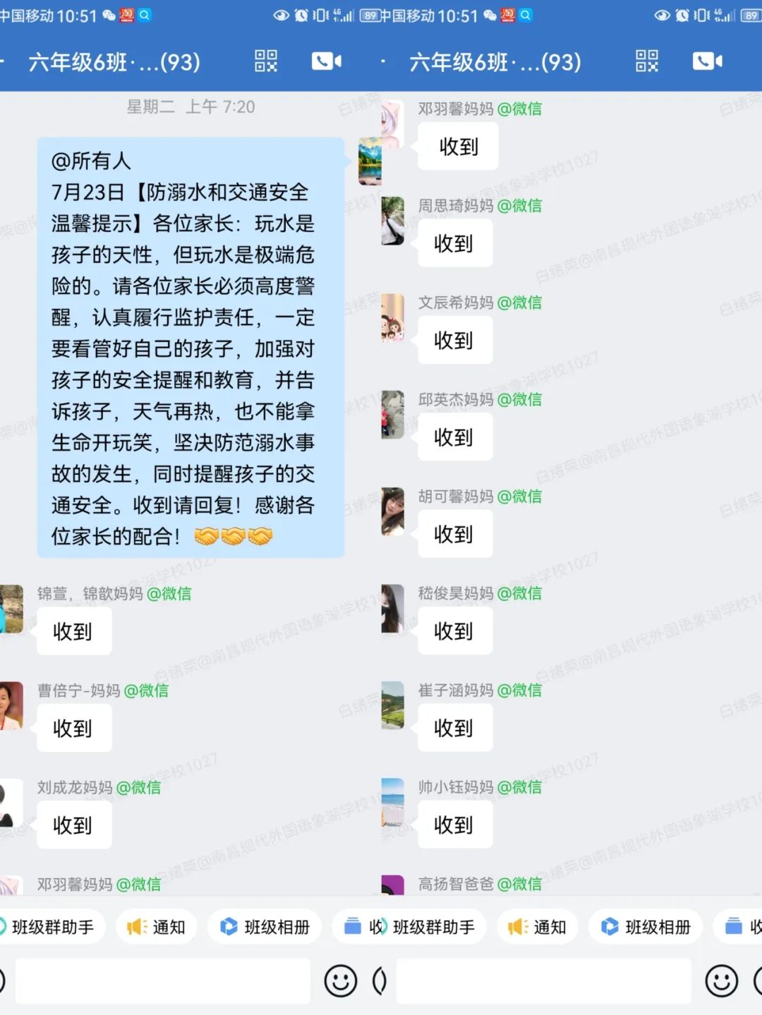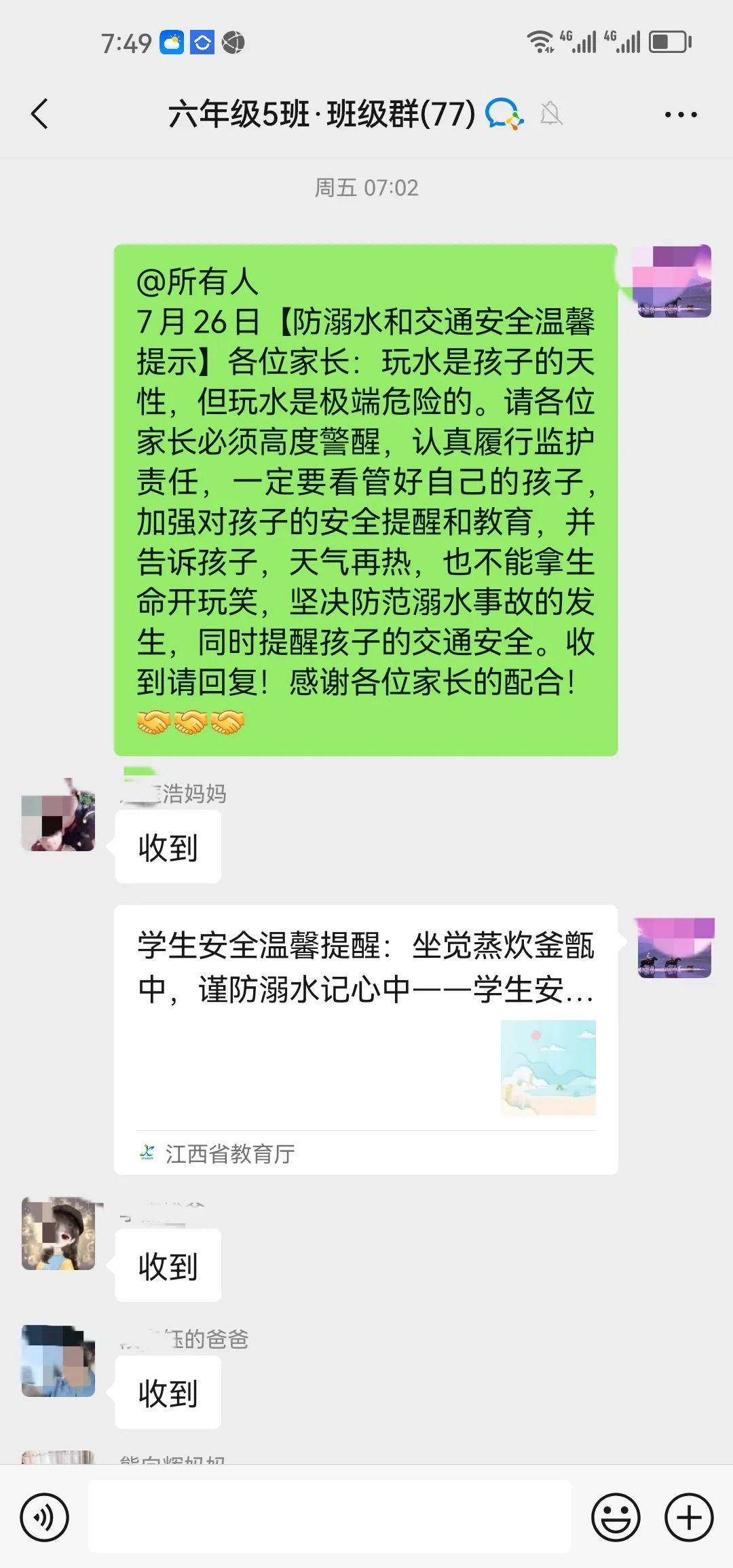 通過家長(zhǎng)群班主任每周推送防溺水信息,每日進(jìn)行防溺水問詢。讓家長(zhǎng)和孩子時(shí)刻提高警惕,懂得對(duì)孩子的防溺水教育不能松懈。