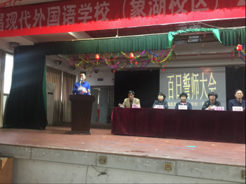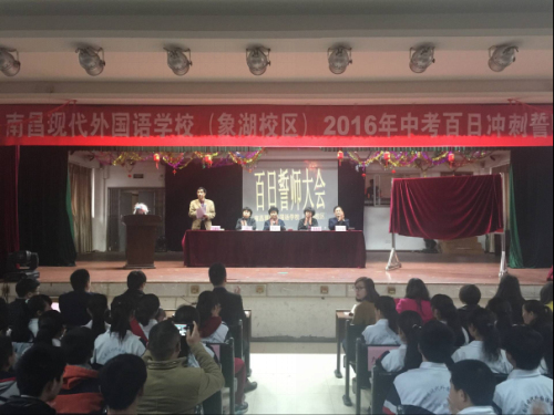 陽春三月,春寒料峭,憧憬六月,激情滿懷。為鼓舞初中畢業(yè)班學(xué)生的斗志,讓他們揚(yáng)起自信的風(fēng)帆,信心百倍的迎接中考,2016年3月8日下午,南昌現(xiàn)代外國語學(xué)校(象湖校區(qū))隆重舉行“2016年中考百日沖刺誓師大會”,學(xué)校行政領(lǐng)導(dǎo),初三全體教師、同學(xué)及家長代表500余人參加了這次大會。