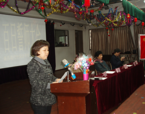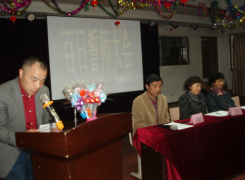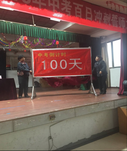 本次大會由年級組長王康民老師主持。首先,在一陣悠揚(yáng)激昂的國歌聲后,李金玉校長、王桂紅校長作為校領(lǐng)導(dǎo)代表在全體師生的共同見證下,拉開了百日沖刺誓師大會的倒計(jì)時牌匾,那醒目的“100天”字樣燦爛生光,照進(jìn)了每一個師生的心間。會上,李金玉校長首先作了重要講話。她在講話中指出:中考的路上不單單是知識的較量,更重要的是心態(tài)的較量,還有毅力、耐力、意志品質(zhì)的考驗(yàn)。每個同學(xué)都要有鍥而不舍、孜孜以求、拼搏奮斗的精神,要有贏的強(qiáng)烈欲望。她希望老師要以最真摯的情感、以最優(yōu)秀的教學(xué)質(zhì)量、最先進(jìn)的教育理念、全力以赴,恪盡職守,把握有限的時間,科學(xué)合理安排教學(xué)進(jìn)度,以最無私的投入、關(guān)愛學(xué)生身心健康,做到一個都不放棄!希望家長要全力配合學(xué)校老師,做好孩子的心理疏導(dǎo),教育孩子要有自信、敢于擔(dān)當(dāng)。最后,李校長總結(jié)了歷年中考成績,尤其是2015屆的初三畢業(yè)生394人,有100人中考考分在500分以上,考取省級第一批重點(diǎn)中學(xué)。