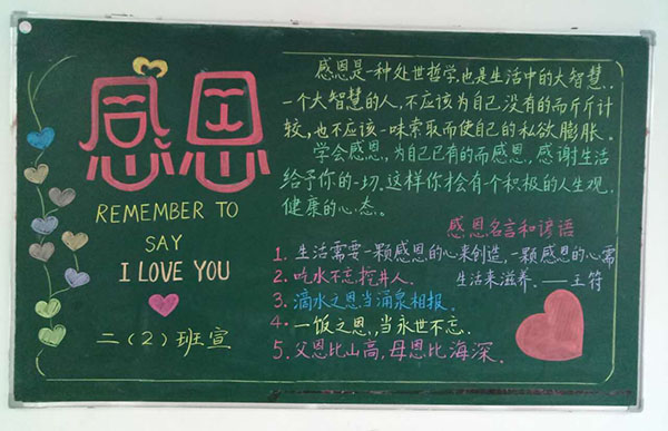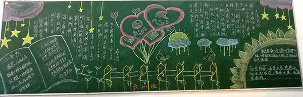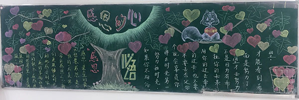 本次活動引起了學(xué)校全體師生的高度重視,活動中,全校師生積極響應(yīng),大家熱情高漲、積極主動,紛紛為張羅黑板報評比活動而忙碌了起來。在老師的指導(dǎo)下,同學(xué)們相互配合、團(tuán)結(jié)協(xié)作,圍繞主題對本次黑板報進(jìn)行了認(rèn)真的構(gòu)思,精心的設(shè)計,一塊塊主題鮮明、色彩和諧、各具特色的黑板報很快便設(shè)計了出來。同學(xué)們通過參與,懂得了感恩的重要,懂得了怎樣去感恩別人,學(xué)會了對父母、學(xué)校、社會心懷感激之情,為校園文化增添了一道亮麗的風(fēng)景線。