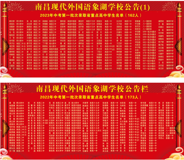 中考成績特別耀眼。從2020年起每年均創(chuàng)造了中考省級一類重高錄取新的紀(jì)錄。2022年中考,第一批錄取省重點173人(錄取率為33.53%),有2人錄取南昌二中海航班。數(shù)學(xué)滿分3人,物理滿分2人、政治滿分41人、歷史滿分12人。